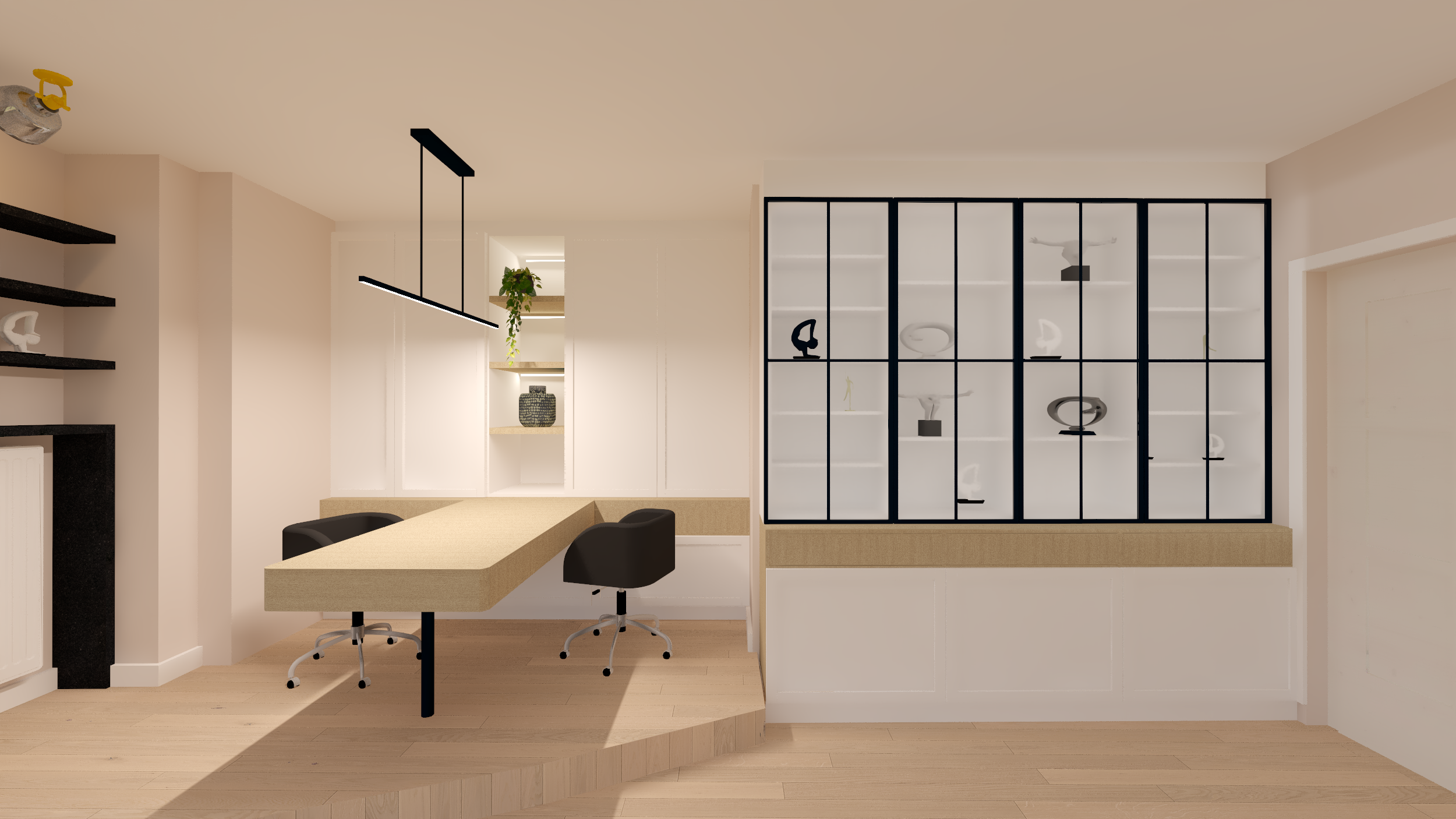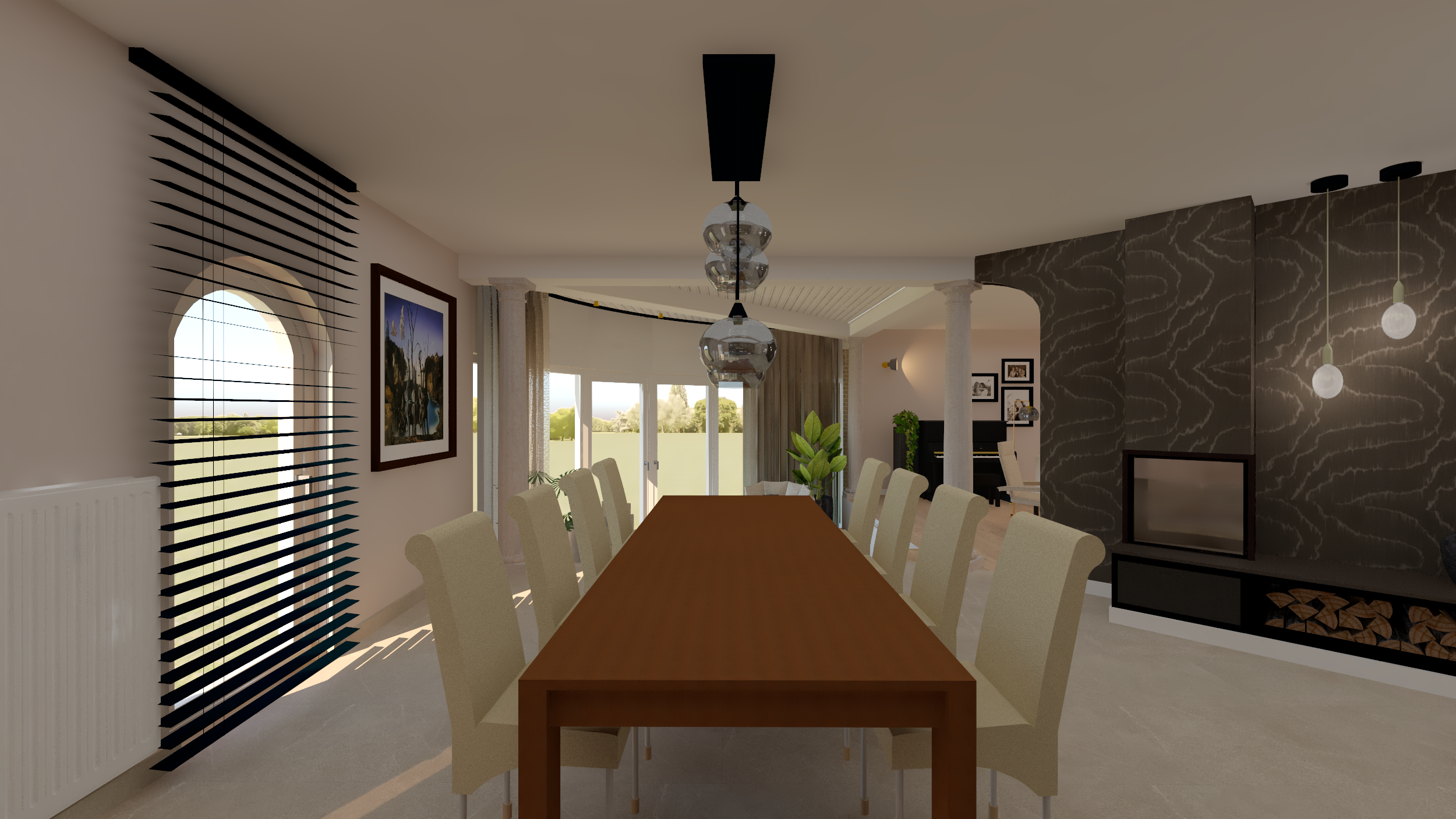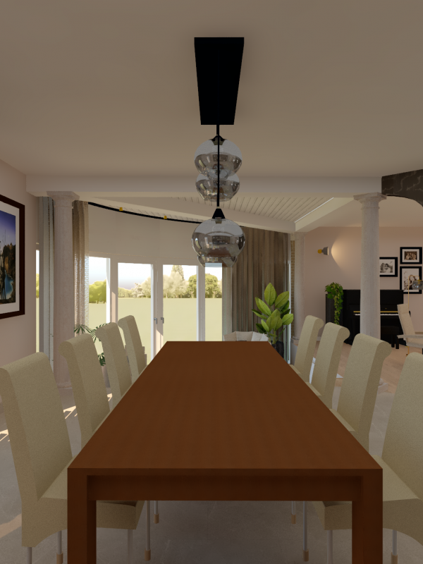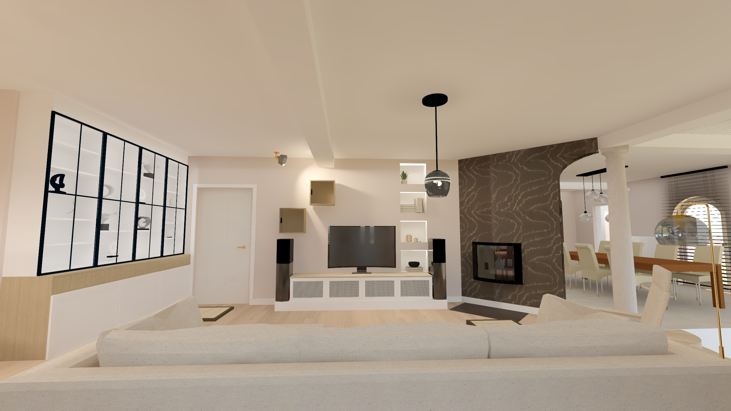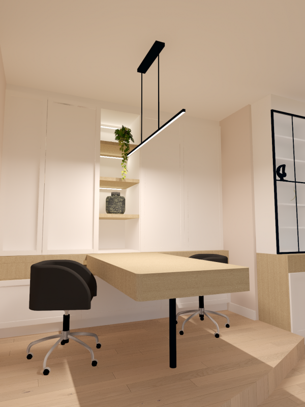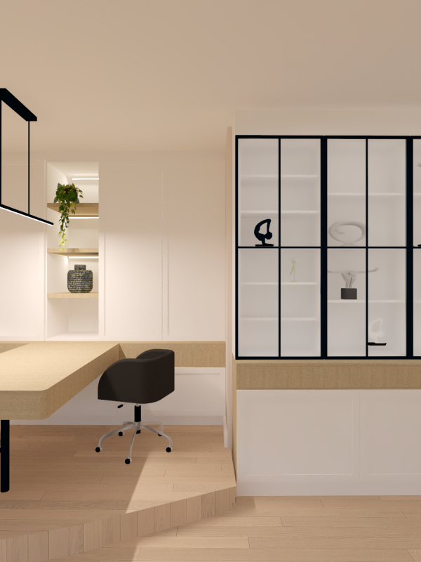 Ce projet complet comprenait une refonte totale de l'espace du rez-de-chaussée, comprenant une salle à manger, une véranda, un salon et un bureau. Dans le cadre de cette transformation, nous avons minutieusement repensé la disposition générale et l'ergonomie, sélectionné avec soin les matériaux et créé une ambiance accueillante grâce au bon choix d'éclairage.