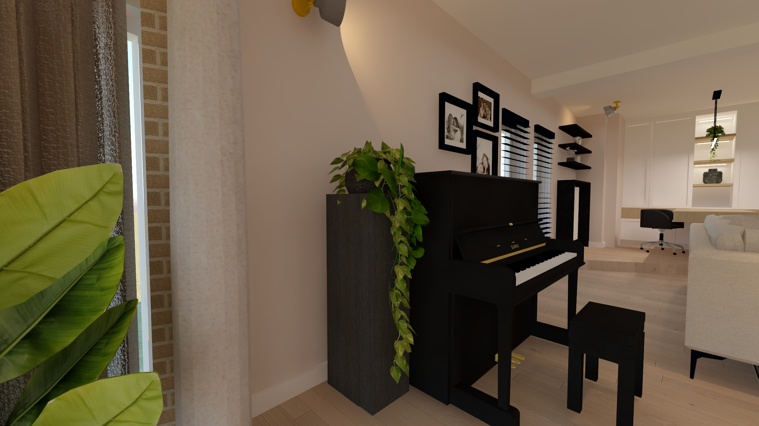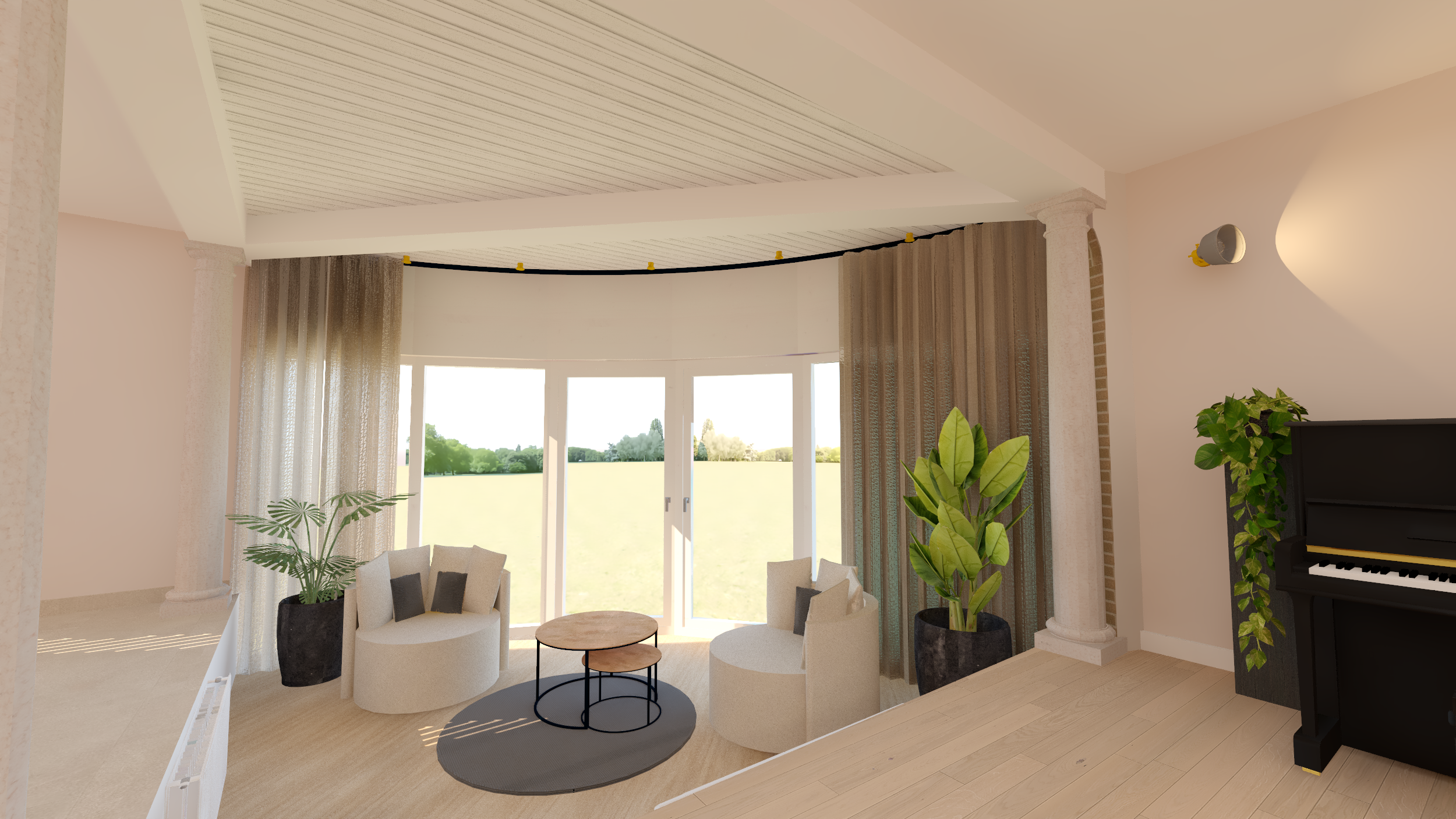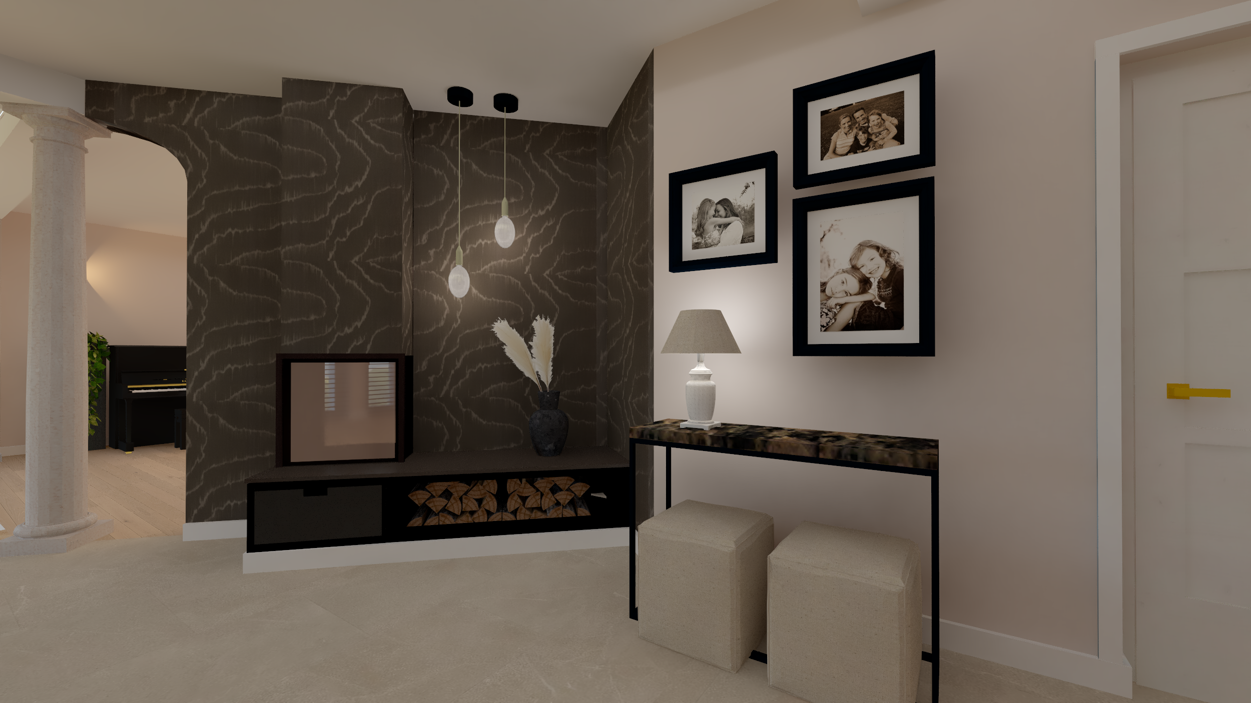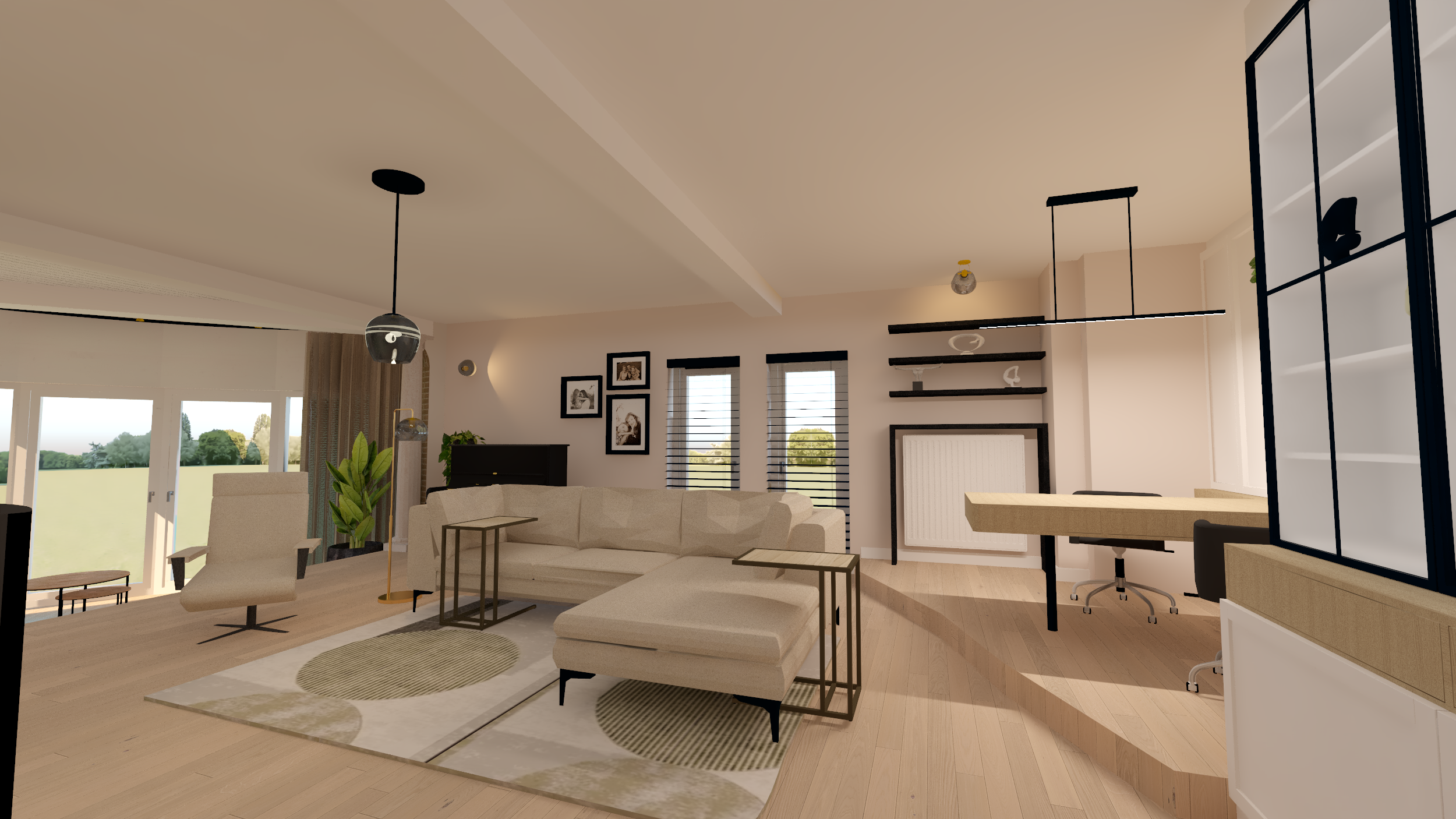 Ce projet complet comprenait une refonte totale de l'espace du rez-de-chaussée, comprenant une salle à manger, une véranda, un salon et un bureau. Dans le cadre de cette transformation, nous avons minutieusement repensé la disposition générale et l'ergonomie, sélectionné avec soin les matériaux et créé une ambiance accueillante grâce au bon choix d'éclairage.