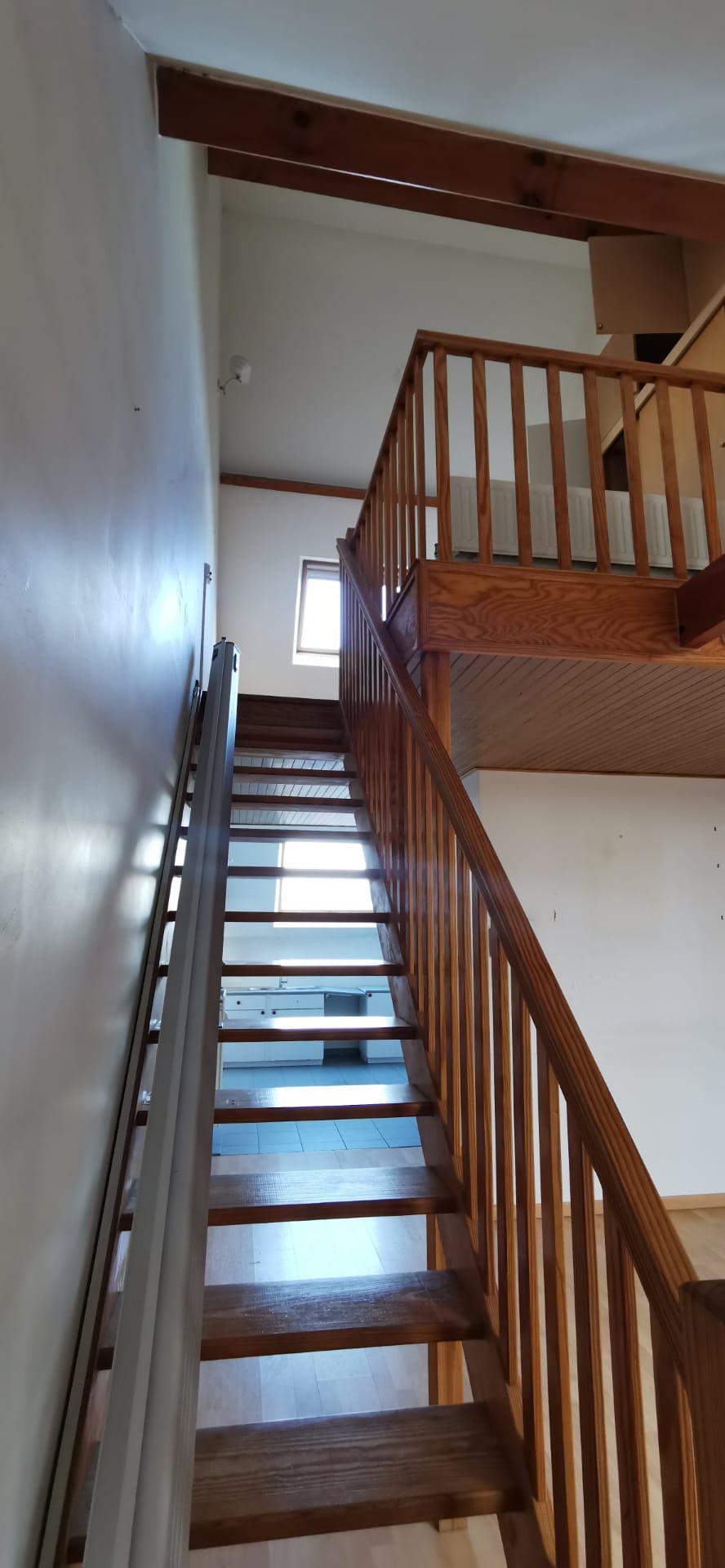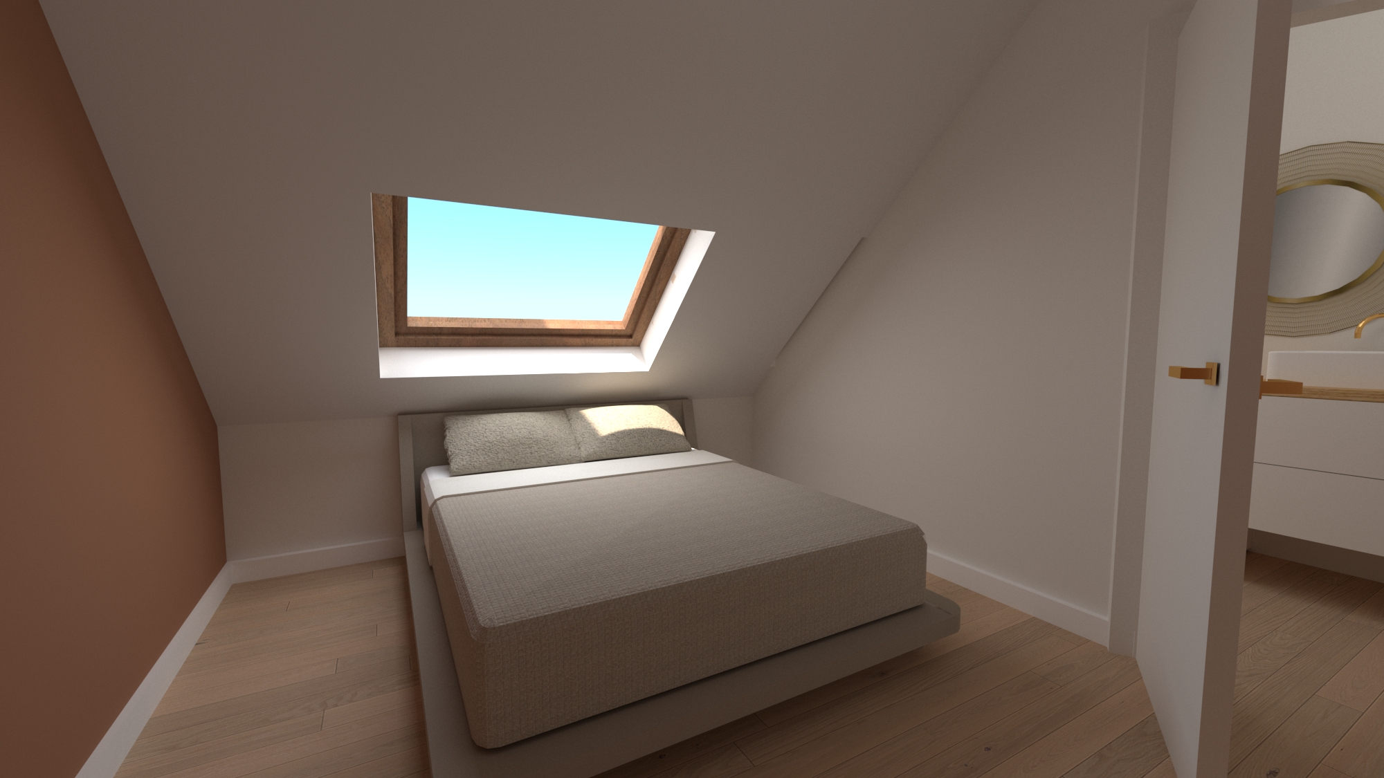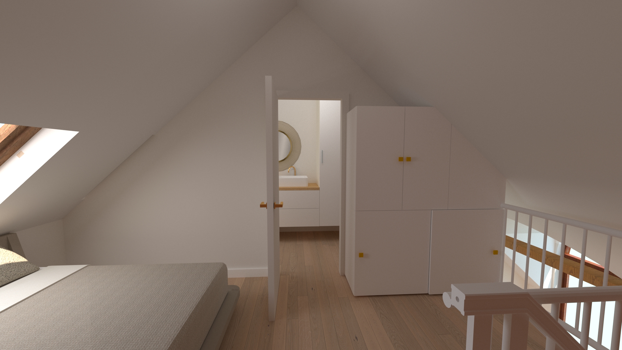La chambre en mezzanine, avec sa salle de bain attenante, est un véritable cocon douillet, où les occupants pourront se ressourcer dans un cadre intimiste et apaisant.